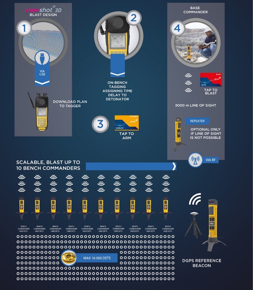 Las aplicaciones futuras que utilizan DGPS incluyen, un módulo independiente que permite la capacidad de DGPS en otros equipos, MPU, equipos de perforación, etc.; una lista común de detonadores actualizada en tiempo real a medida que varios usuarios o máquinas etiquetan los detonadores; y una interfaz de usuario centralizada: actualización gráfica en tiempo real del proceso de implementación.