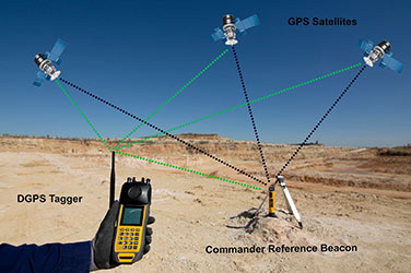- La precisión de DGPS se logra mediante el uso de un receptor de referencia (CE4 Commander) en una ubicación topográfica conocida que transmite datos de corrección al etiquetador.